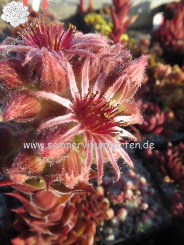 Hier haben wir einen auffallend gefärbten Sämling von 'Gabrielle'. Die gut sprossenden Rosetten erreichen einen Durchmesser von 10cm und bilden ganz dichte Polster. Das rotlila gefärbte Zentrum behält auch im Sommer gut die Farbe und zeigt einen starken lila Schimmer, welcher einen metallischen Eindruck erzeugt! Leider kann man dies nur sehr schwer auf Fotos wiedergeben. Besonders beeindruckend ist die bunt leuchtende Sommerfärbung, die sich den ganzen Sommer gut hält. Die hellrosa Blüten besitzen schmale Blätter und dunkelrote Staubfäden. Eine Pflanze mit sehr guten Eigenschaften.