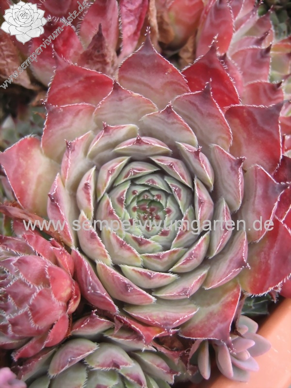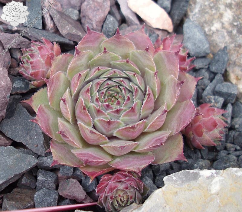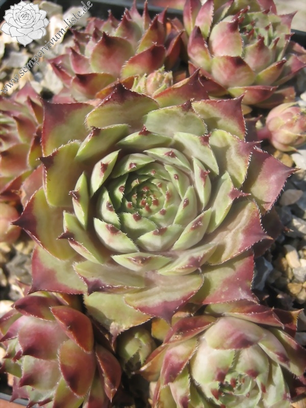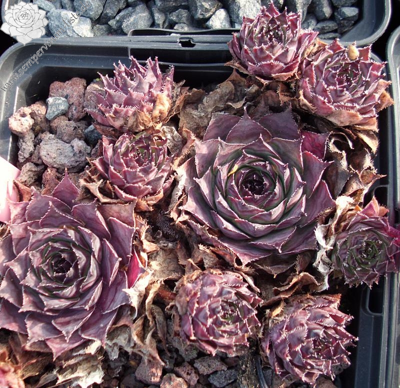 Die Mutterpflanze dieses Sämlings steht in den Sammlungen unter S. tectorum x S. calcareum. Leider hat sich gezeigt, dass sobald sich andere Formen mit S. calcareum kreuzen, das S. calcareum–Blut schnell verloren geht. Von den Sämlingen der Absaat besaßen nur sehr wenige Pflanzen noch das typische Aussehen von S. calcareum. Im Frühjahr zeigen sich die Rosetten mit einer sehr kühlen Grundfärbung. Das helle Grau wird abgerundet von helllila Blattenden, welches man von S. calcareum kennt. Besonders kräftig gefärbt sind die Blattspitzen, die ein intensives Rotlila besitzen und sich dadurch deutlich abheben. Im Sommer wird die Färbung wärmer und zeigt ein kräftiges Rosarot, mit dunkleren Spitzen. Die Rosetten können einen Durchmesser von 6 cm erreichen und sind willig sprossend. Leider nur wenige Rosetten!