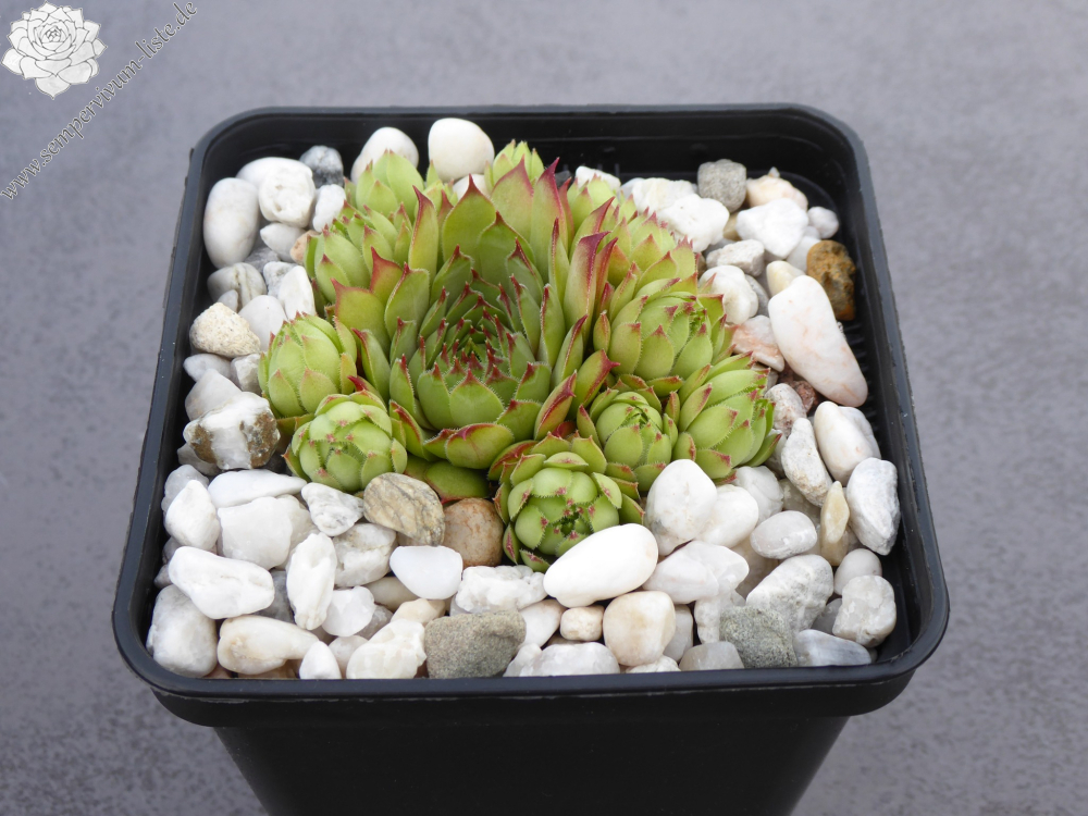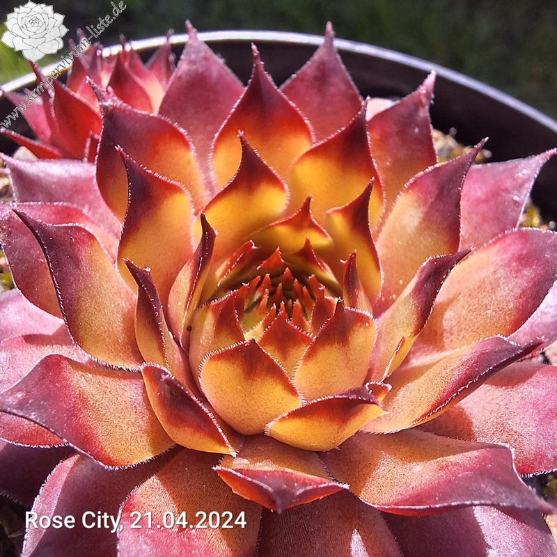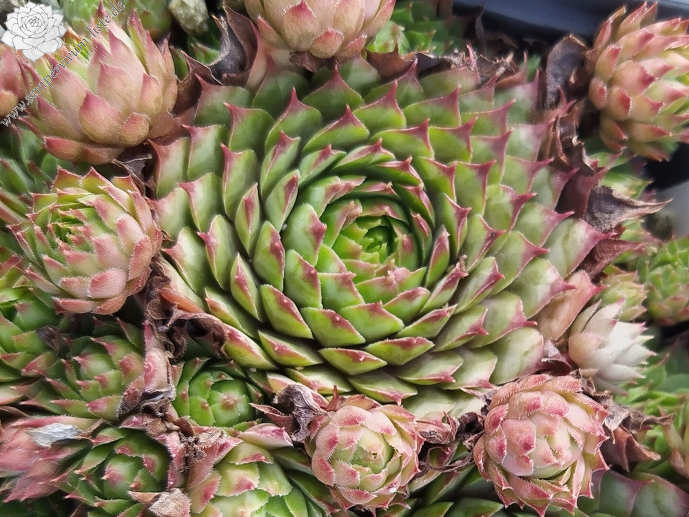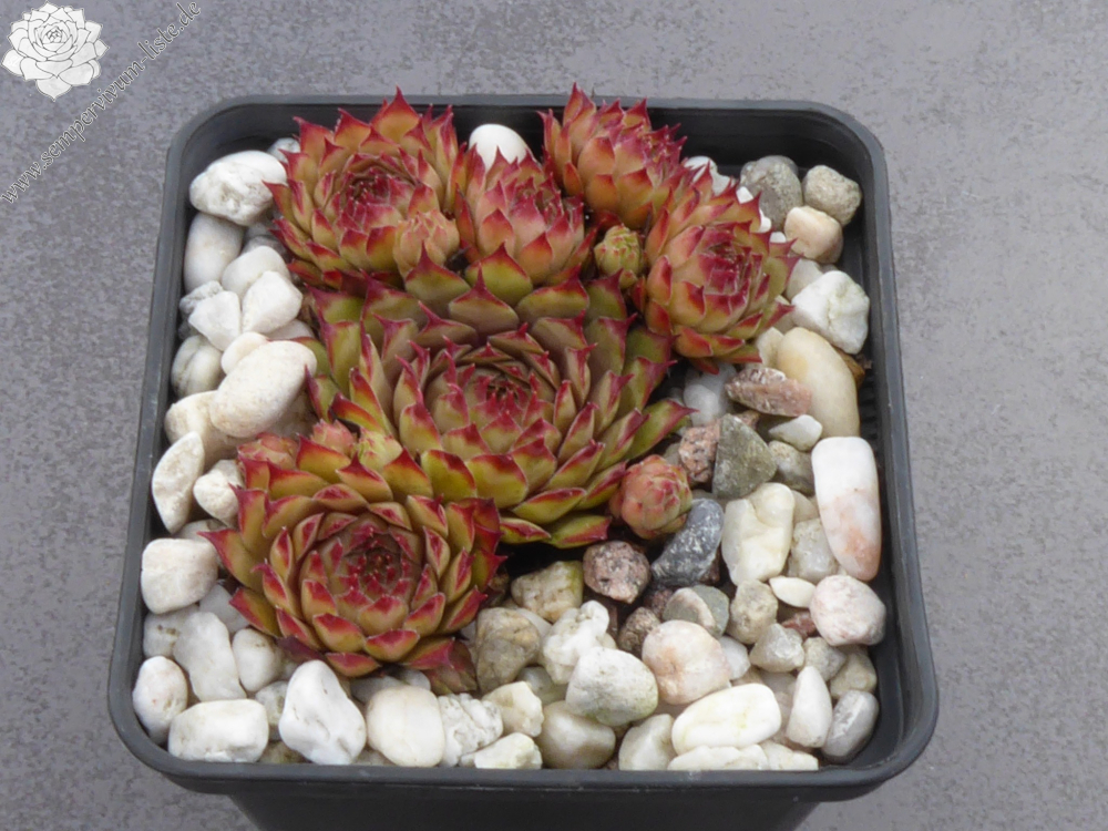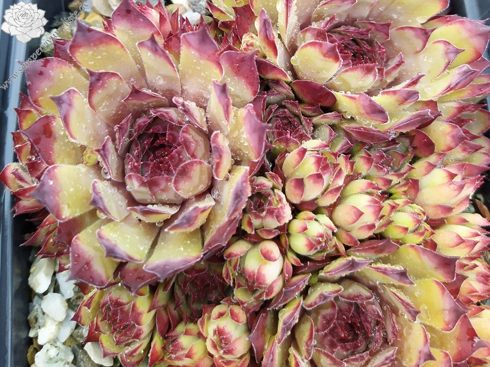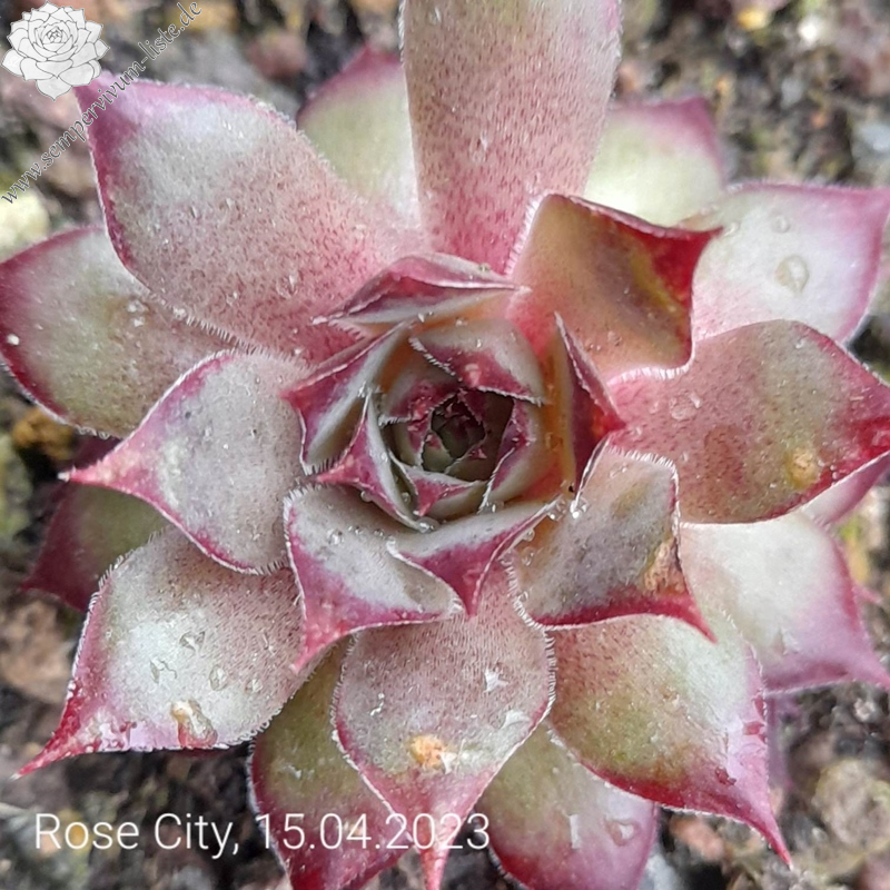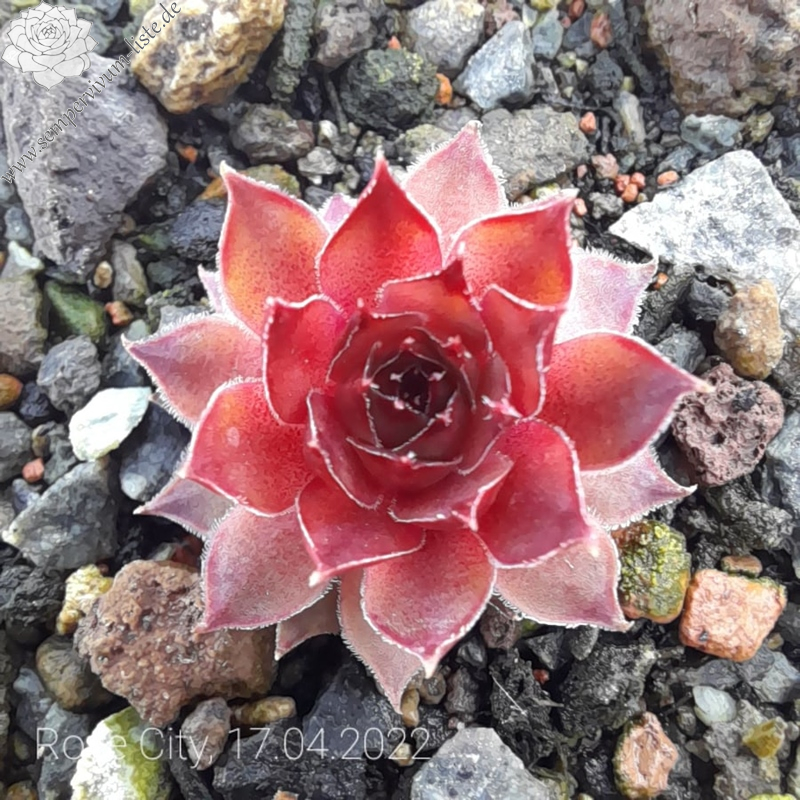 Nice rose-red rosettes open in spring with most of the color in the leaf margins. With summer heat they fade to green. Cool weather brings out deep color for the winter. Medium. Don Mylin, 2020.