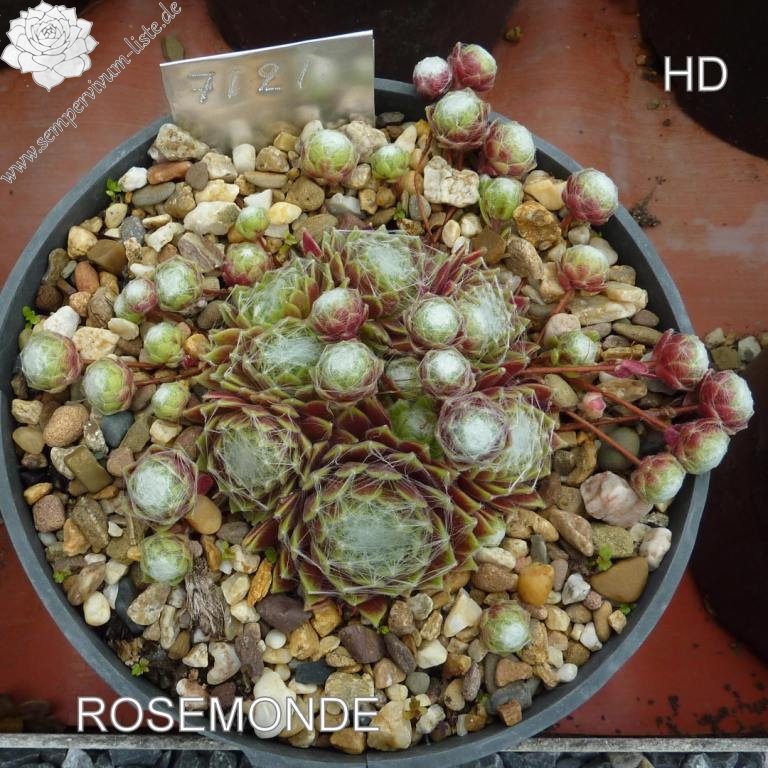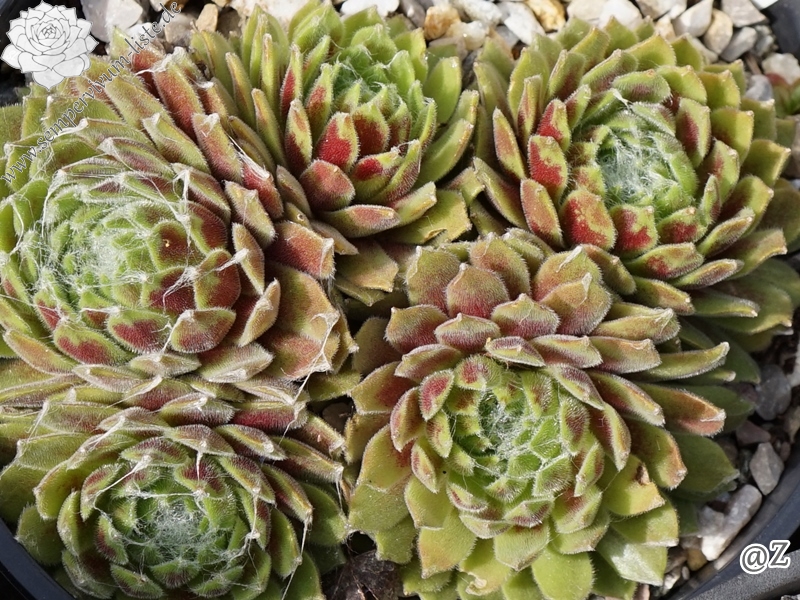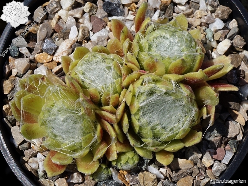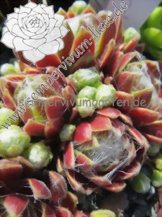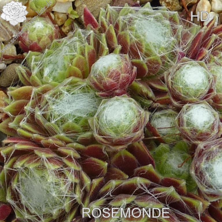 Sempervivum 'Rosemonde' ist ein bunter Spinnweb-Hauswurz. Die Blätter leuchten in roten und grünen Farben und sind nur leicht besponnen. Die Rosetten erreichen einen Durchmesser von 5cm und sprossen willig. Es werden schnell große Polster gebildet. Super!