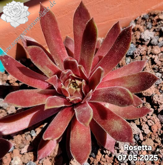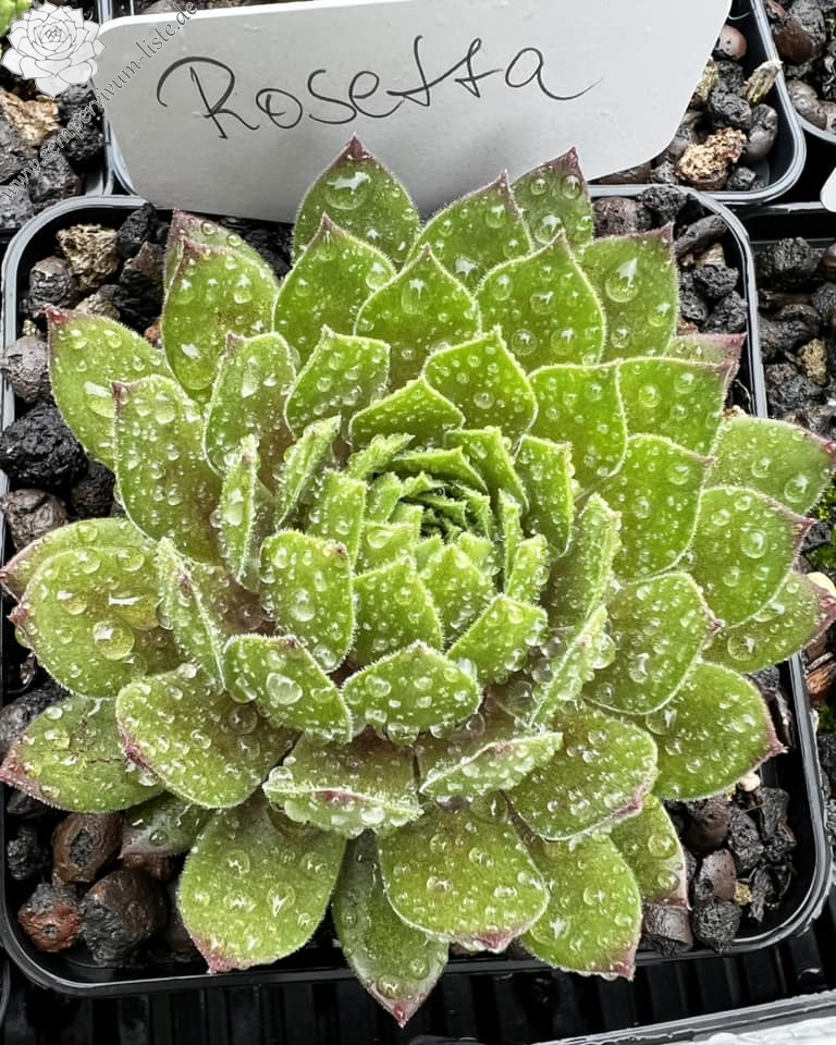 Im Frühjahr sind die zartbewimperten, samtigen Blätter von Rosetta rotbraun. Die inneren Blätter sind im oberen viertel hellgrün mit einem bräunlichen Dorn. Die Blätter um das Herz stehen fast senkrecht nach oben. Im Hochsommer zeigen die Spitzen der Rosettenblätter leuchtendes Pink, zur Basis hin werden sie heller, beigefarben mit einem dunkleren Dorn und das geschlossene Herz wird grün. Die äußeren Blätter sind pinkfarben und insgesamt nun schmäler, sie zeigen einen sehr schönen und auffälligen Farbverlauf.