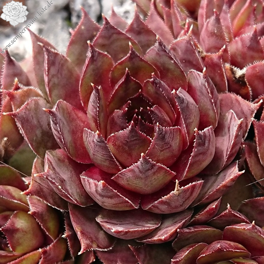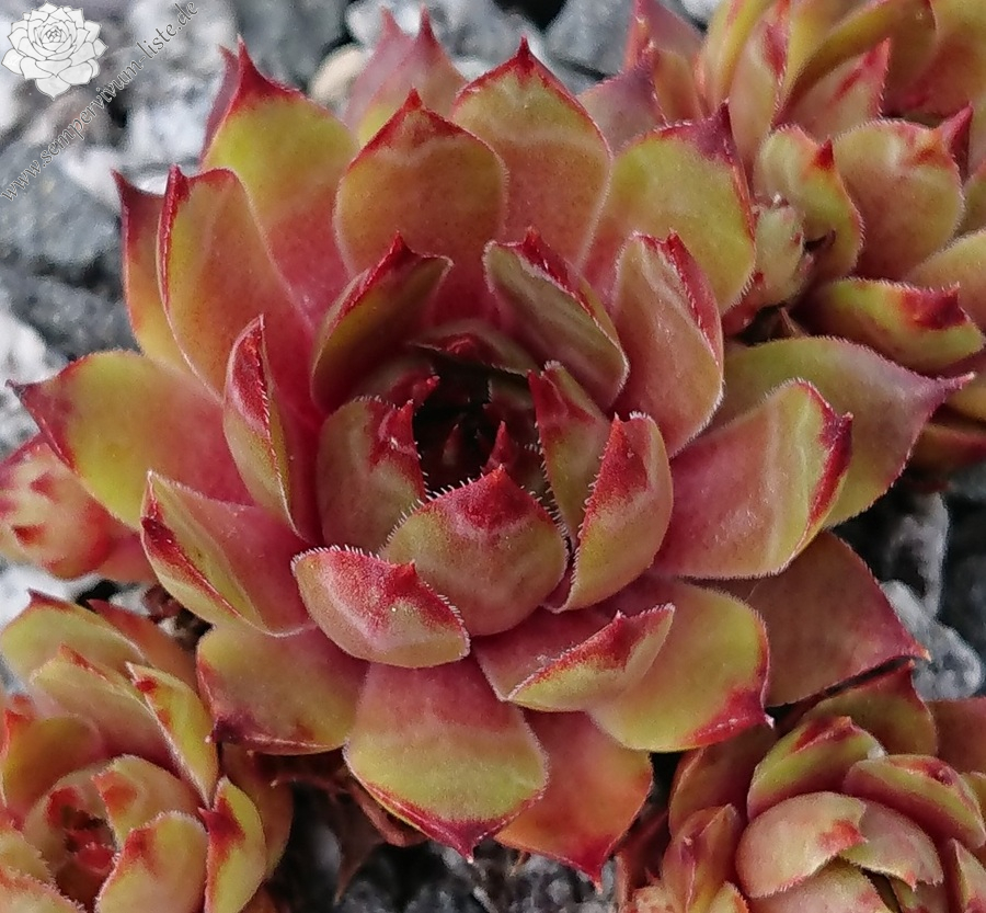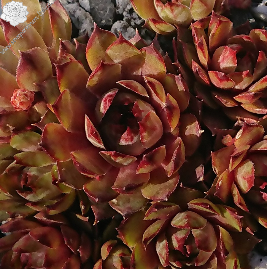 ‘Roter Goldschatz’ ist ein Sämling von ‘Moby Dick’ aus 2021 . Die Sorte bildet recht kleine bis mittelgroße, kompakte Rosetten. Besonders charakteristisch sind die feine Marmorierung an den Blattenden sowie die leuchtend roten Blattspitzen, die das ganze Jahr über sehr gut sichtbar bleiben. Die Farben wechseln von warmen Gold- und Gelbtönen mit kräftigen roten Akzenten im Frühjahr und Sommer zu tieferen rot-braunen und burgunderfarbenen Nuancen im Herbst. Die Pflanze ist robust, wächst zuverlässig und kindelt gut. Ich kultiviere alle Sempervivum und Jovibarba ganzjährig ungeschützt im Freien in sehr mineralischem Substrat. Das macht sie widerstandsfähig gegenüber extremen Temperaturen und jeder Witterung.