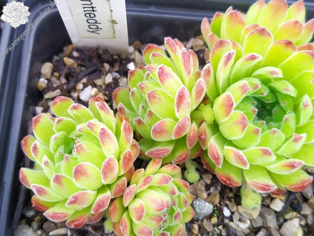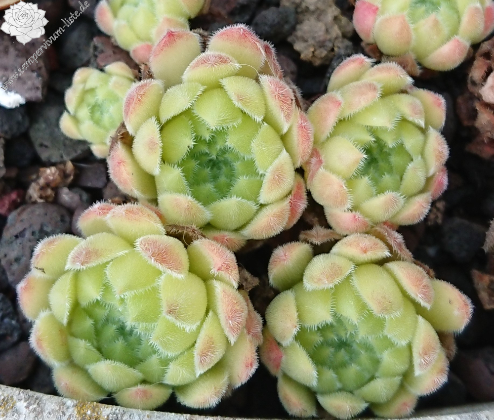geschlossene Rosetten bis 6 cm Größe, dicke fleischige kurze Blätter, grün gelblich mit wenigen rotbraunen Spitzen, überall samtig behaart, Blüte gelb, interessantes Erscheinungsbild, Zufallssämling