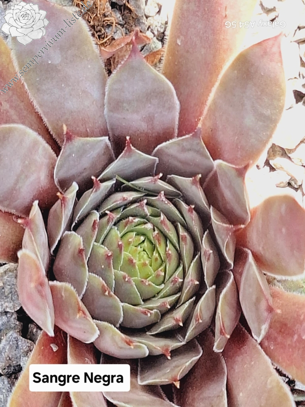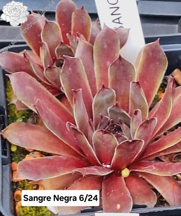 SANGRE NEGRA (Schwarzblut) Sämling von 2021/23 (Premierenjahr 2023) Mutter 'Schutz Hybrid'. Ein sehr hübscher Sämling mit matten, dunkelblutfarbenen Blättern, die Blattspitzen sind leicht grün, die Farben verblassen im Sommer. Die Rosetten haben einen Durchmesser von ca. 6-7 cm. Foto vom 14.05.23.