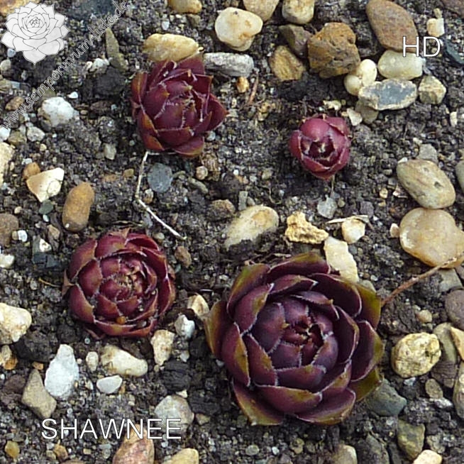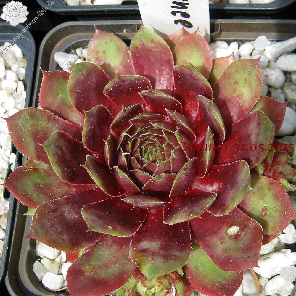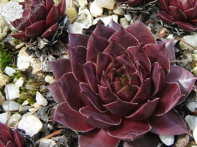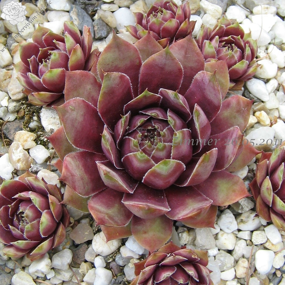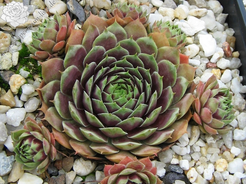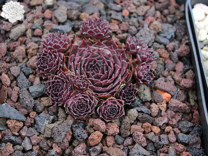 Diese attraktive Hybride wurde bereits Anfang der 80er Jahre in Deutschland gezüchtet: mittelgroße Rosetten, deren Zentrum im Frühjahr dunkelviolettrot gefärbt sind. Sehr schön sind auch die kontrastreichen pastelgrünen Blattspitzen, deren Ränder sich im Herbst orange verfärben!