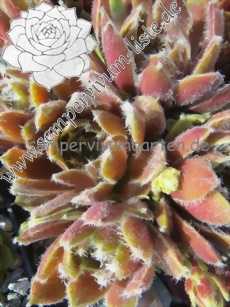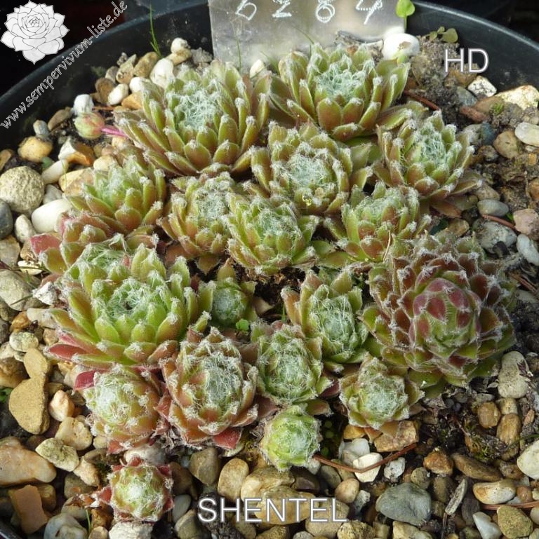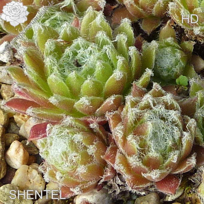 Sempervivum 'Shantel' besitzt eine auffallend kühle Färbung. Die mittelgroßen Rosetten sprossen willig und bilden dichte Polster. Die Blattenden sind leicht, weiß behaart und runden das Gesamtbild hervorragend ab. Eine schöne, kühl gefärbte Pflanze.