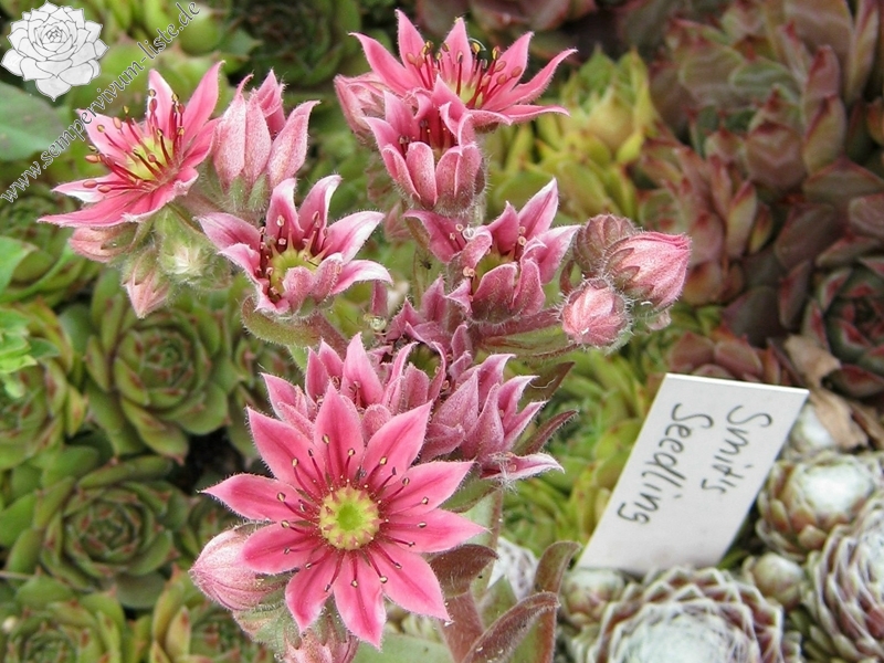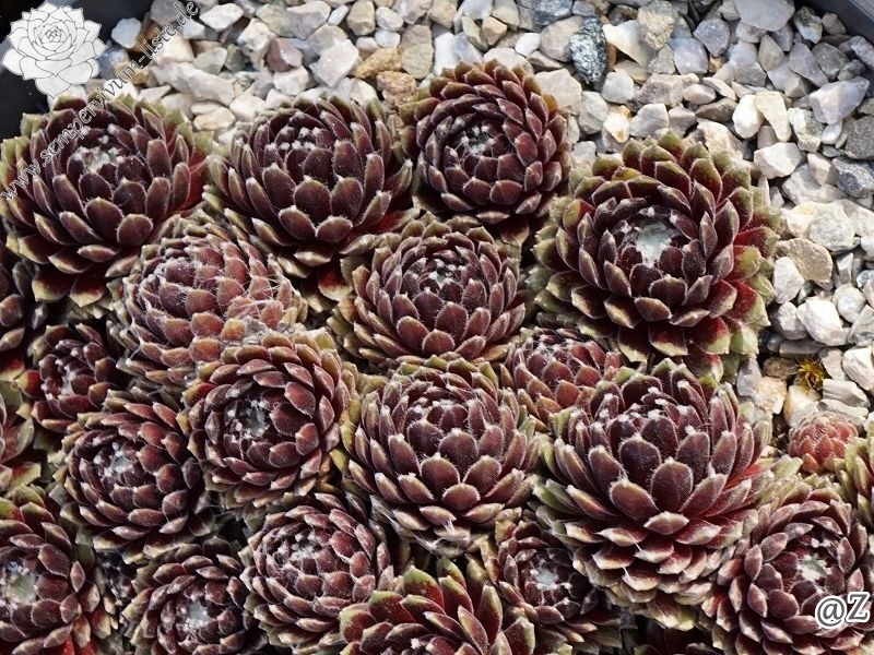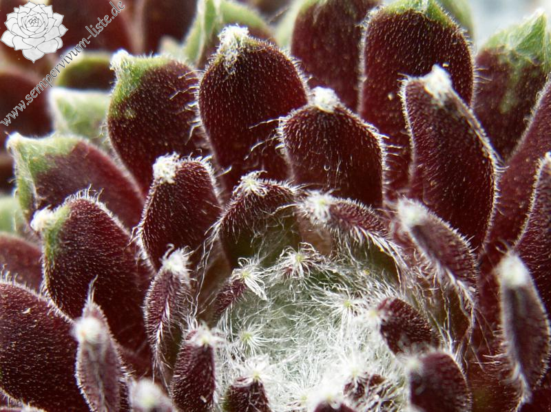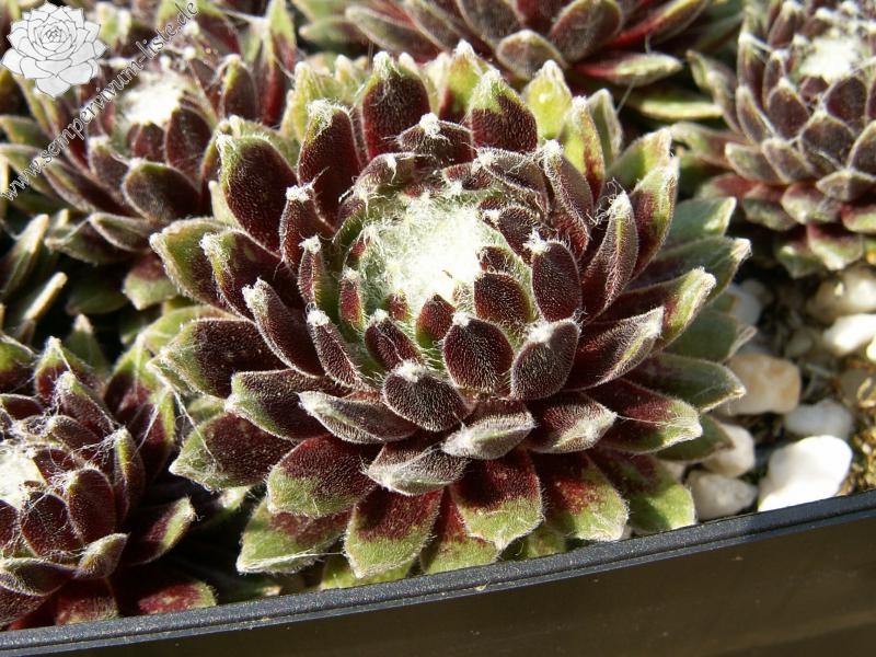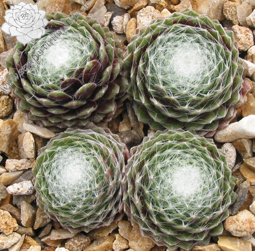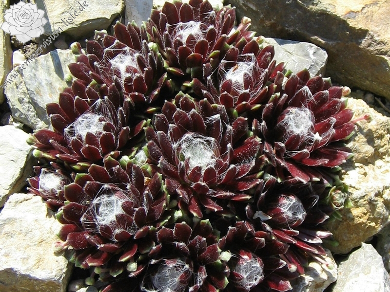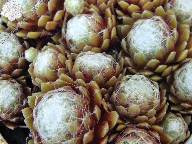 Ein belgisches Kind der 70er Jahre mit stark übersponnenen Rosetten. Der Durchmesser ist für eine Spinnwebhauswurz relativ groß. Zum Sommeranfang verfärben sich die äußeren Blattunterseiten in auffallend ockerfarbene Töne.