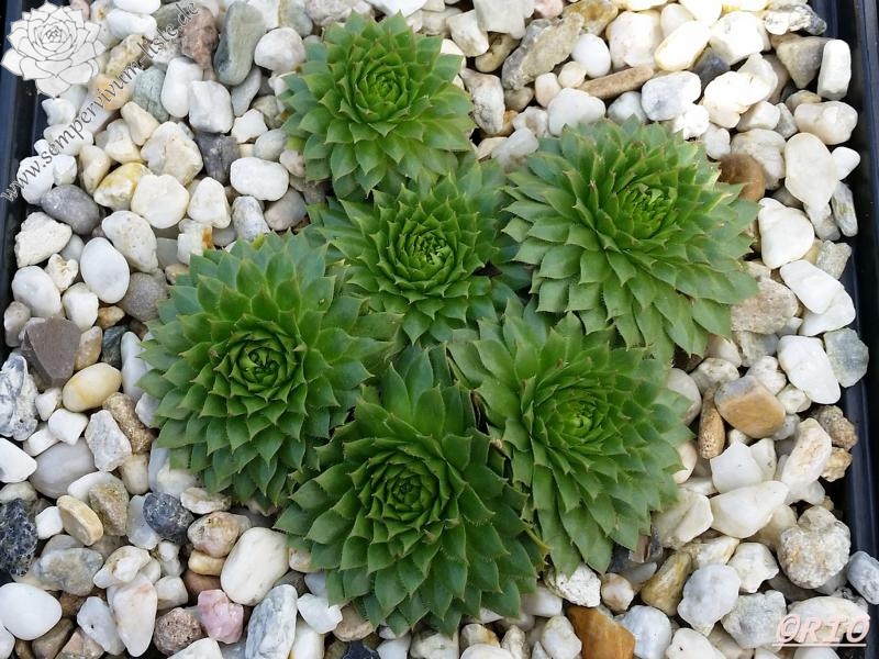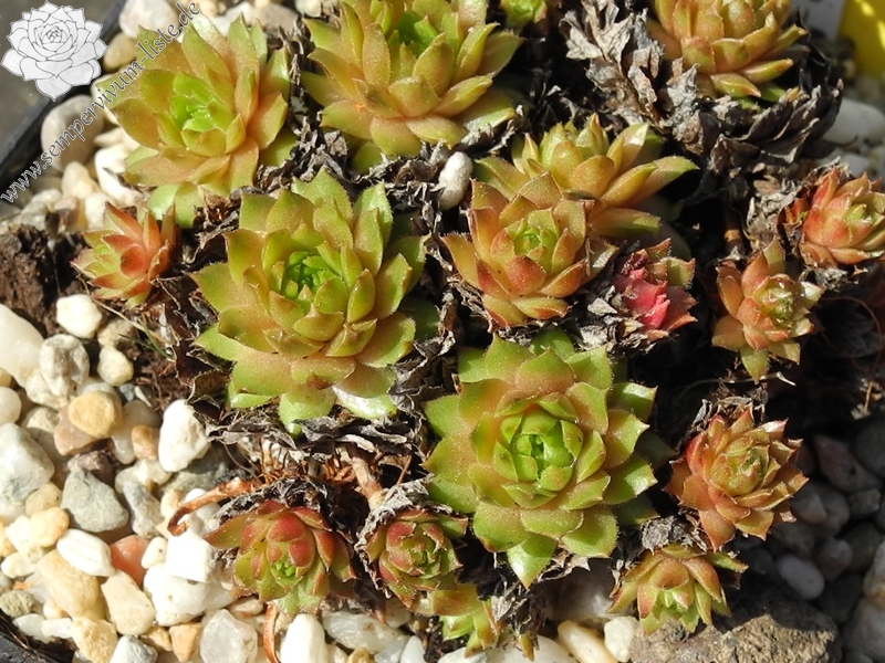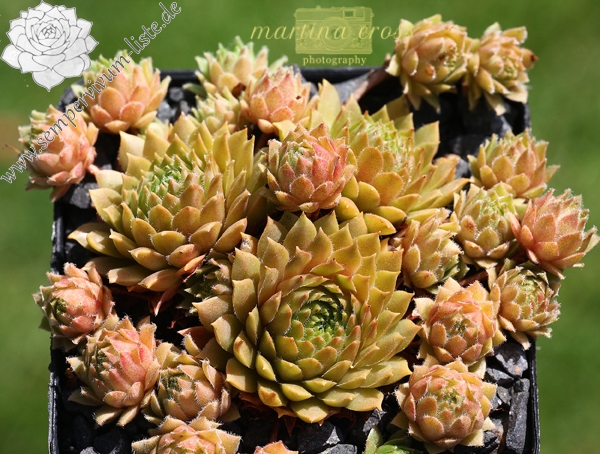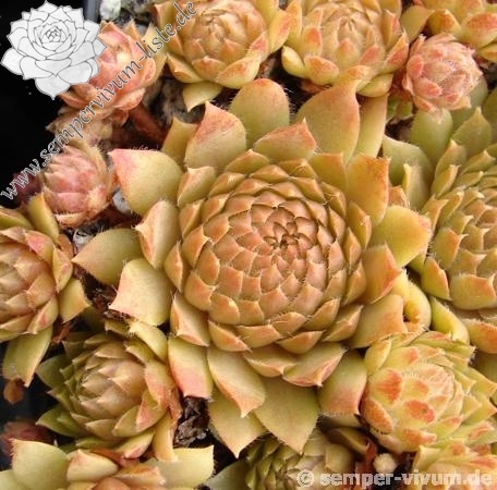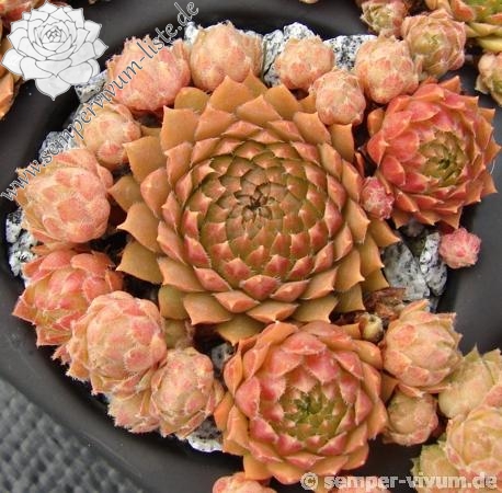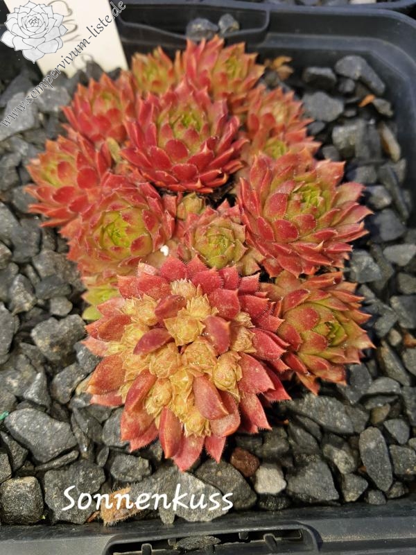 Erstaunlich was die S. wulfenii Hybride 'Else' für beeindruckende Nachkommen hat, die öfter aber auch etwas langsamer wachsen. Unsere Auslese 'Sonnenkuss' hingegen formt schnell kompakte Polster mit etwa 1,5 Zentimeter großen Rosetten. Die meisten benannten Hybriden zeigen ja im Frühjahr ihre prächtigste Färbung, doch dieser Zwerg hat seinen Höhepunkt von Juli bis August. Die von lachs- über orange- bis rosafarbenen Nuancen lassen dann in Ihrem Garten einen tagelangen Sonnenuntergang geschehen!