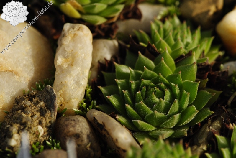 Zu den Pflanzen: Die großen Rosetten haben etwa 3 cm im Durchmesser. Die Rosetten sind vor allem grün oder dunkel grün gefärbt, die Spitzen der Rosettenblätter sind lila oder dunkelrot gefärbt. Die Rosetten haben nicht so eine große Menge der Rosettenblätter wie z. B. die Rosetten von Sempervivum macedonicum. Die Rosettenblätter sind dick und sie sind dicht und ziemlich lang drüsig behaart. Die Behaarung ist nicht so dicht wie bei S. macedonicum. Die Ausläufer sind ziemlich lang und dick. Die Blüten habe ich noch nicht gesehen.