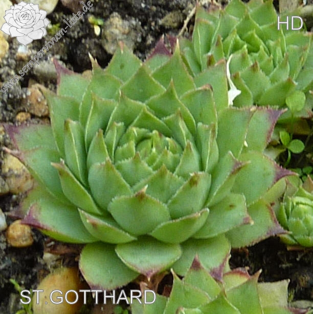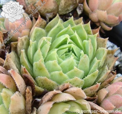 Eine reizende Hybride aus der Schweiz mit auffallend spitzen Rosetten. Sie sind relativ klein mit einer lieblichen jadegrünen Farbe. Die Blattspitzen sind zeitweise leicht bräunlich-orange getönt. Eventuell könnte es sich auch um einen Naturfund handeln.
