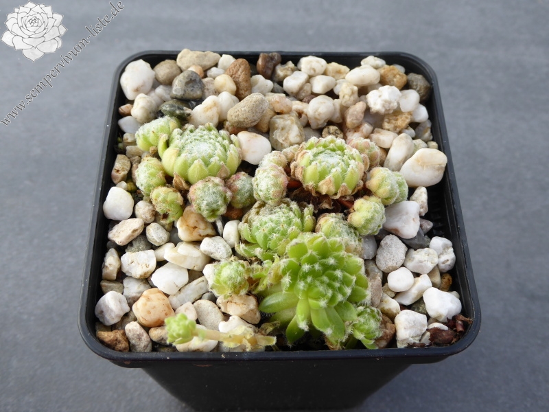Eine neuere Züchtung von André Smits. Die knospenförmigen Rosetten sind nur im Zentrum behaart. Die Blattaußenseite ist fast glänzend und zeigt eine hellgrüne Farbe. Ein ganz neues Erscheinungsbild! Der mittelgroße Spinnwebhauswurz sprosst willig