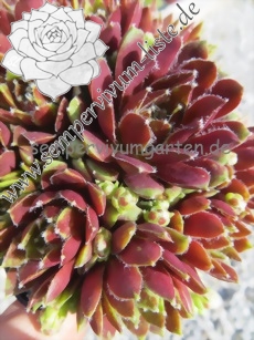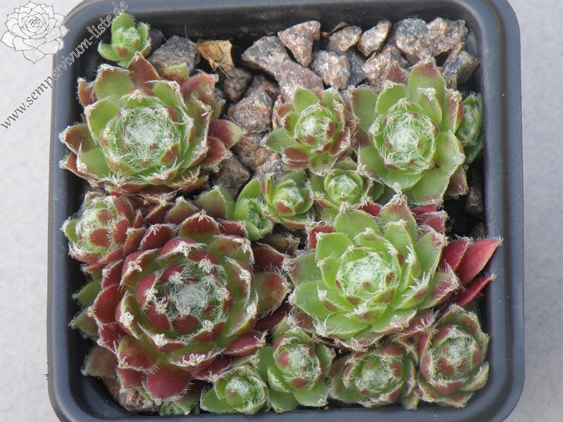 Die belgische Sorte formt kompakte Polster mit rötlichen Rosetten mit bräunlichen Nuancen. Die Spitzen sind mit einem kontrastreichen, weißen Wattebüschel versehen. Im Frühsommer wechseln die Farben zu Rosa mit hellgrünem Zentrum.