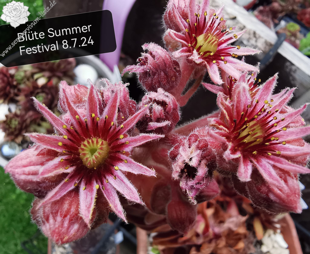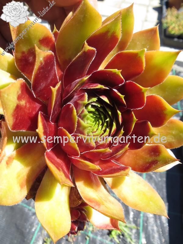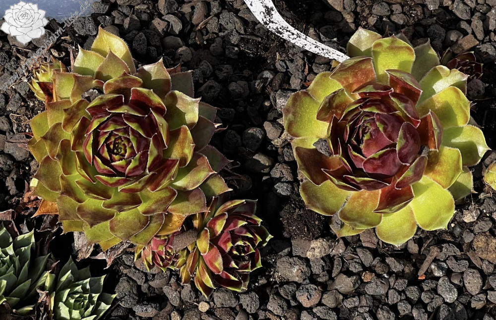 Mit Sempervivum 'Summer Festival' haben wir einen ganz neuen Hauswurz im Sortiment, der im Sommer unglaublich bunte Farben zeigt. Die Rosetten erreichen einen Durchmesser von über 9 cm und sprossen willig. Dieser Verwandlungskünstler fällt das ganze Jahr über auf. Die Färbung hält sich sehr gut und verträgt auch höhere Temperaturen. Das große, warm rot gefärbte Zentrum fällt sofort ins Auge. Die Blattenden besitzen eine hellgrüne Färbung und zeigen besonders im Sommer fast gelb/orange Töne. Im Sommer gefallen mir besonders die gelben Blattränder. Die Pflanzen besitzen einen ganz eigenen Reiz und begeistern rund ums Jahr. Die Blüten werden gerne von Insekten besucht.
