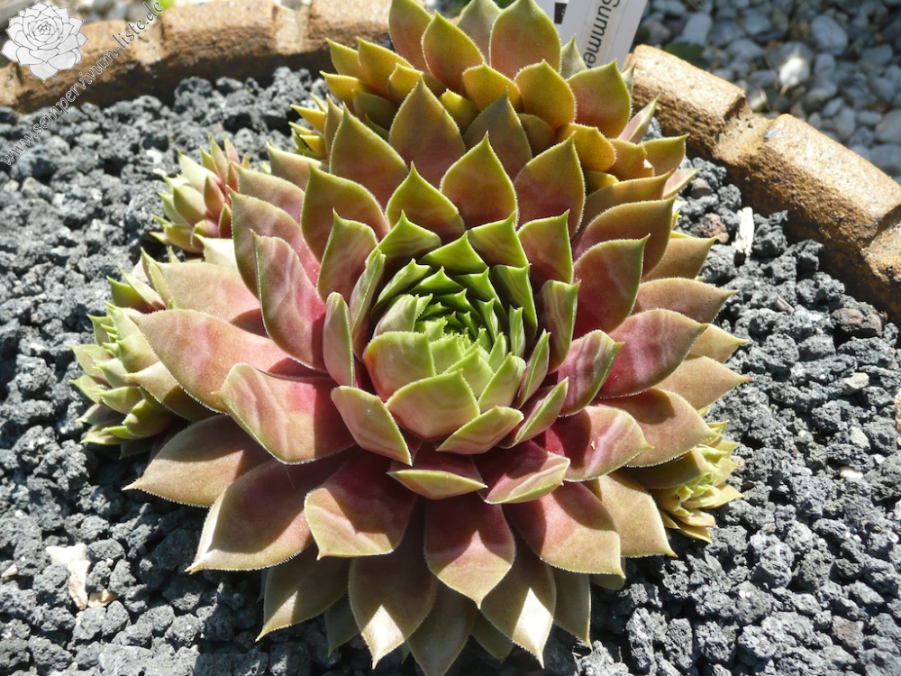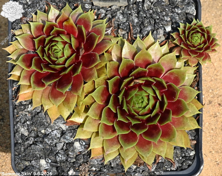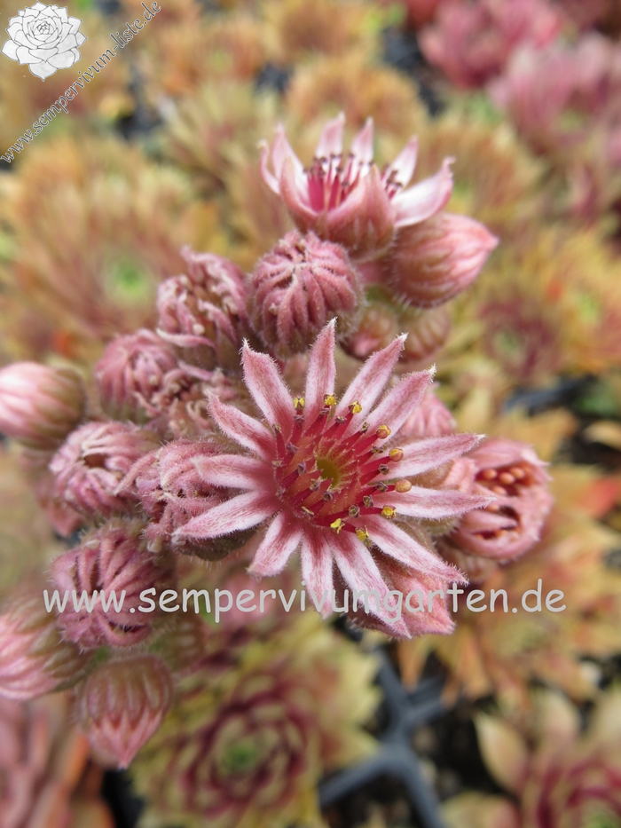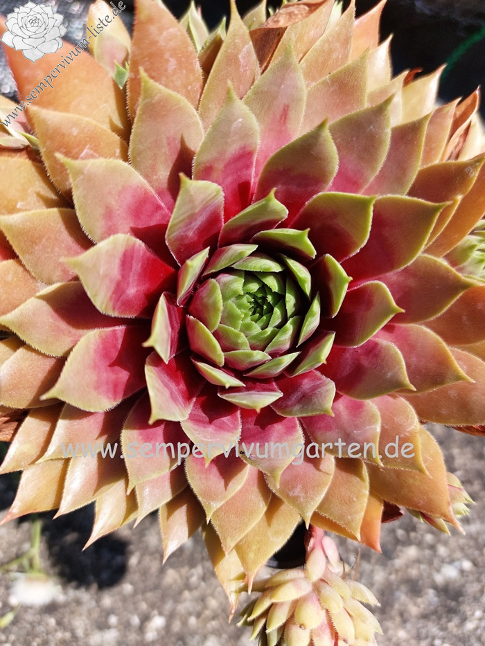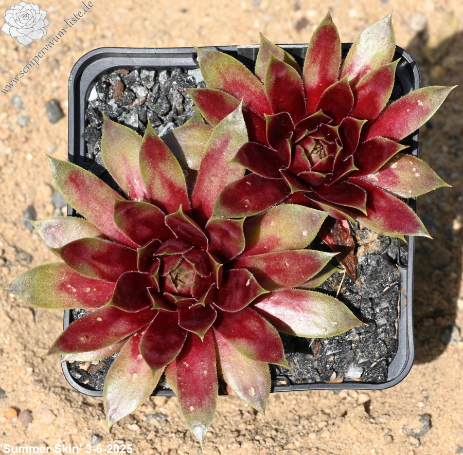Mit Sempervivum 'Summer Skin' haben wir einen ganz neuen Hauswurz im Sortiment, der im Sommer unglaublich schöne Farben zeigt. Die Rosetten erreichen einen Durchmesser von über 10 cm und besitzen auffallend schmale Blätter. 'Summer Skin' ist wüchsig und bildet ganz dichte Polster. Besonders gut gefällt mir die interessante Rosettenform, mit den langen spitzen Blättern. Die Färbung hält sich lange und verträgt auch höhere Temperaturen. Das warm lilarot gefärbte Zentrum fällt sofort ins Auge und hebt sich deutlich von den Blattenden ab. Die Blattenden besitzen eine helle Färbung und zeigen besonders im Sommer fast hautfarbene Töne. Als kleines Extra besitzen die Rosettenherzen blaugrüne Farben . Die Pflanzen besitzen einen ganz eigenen Reiz und begeistern jeden Sommer aufs Neue. Die Blüten werden gerne von Insekten besucht.