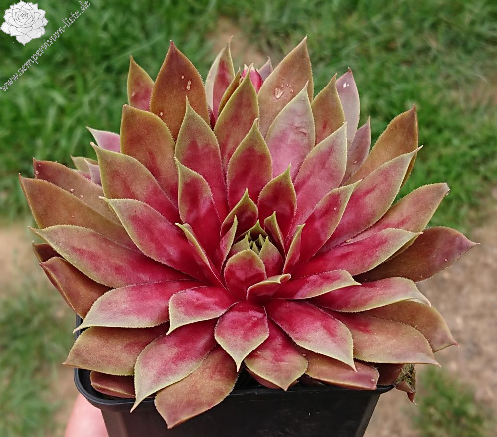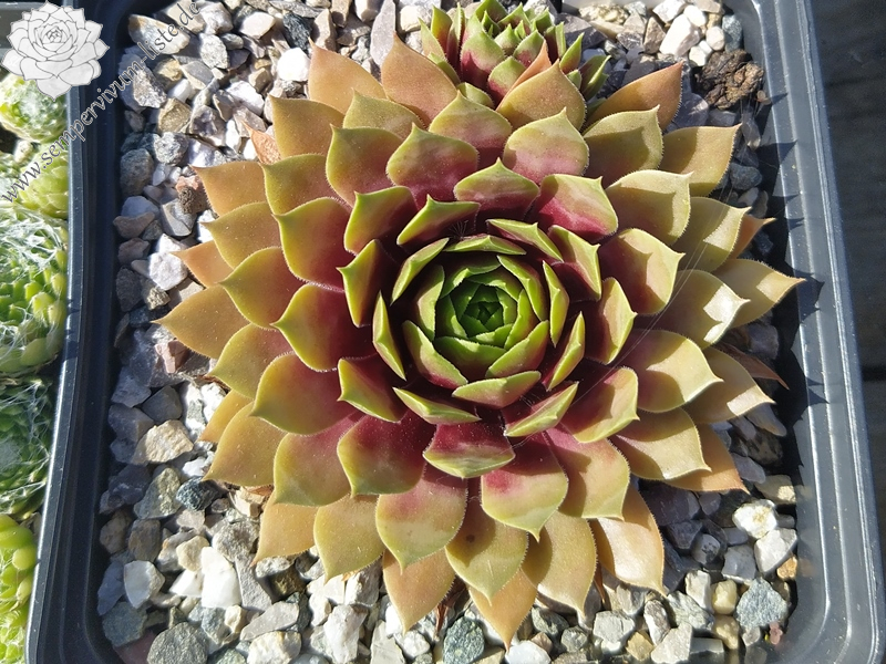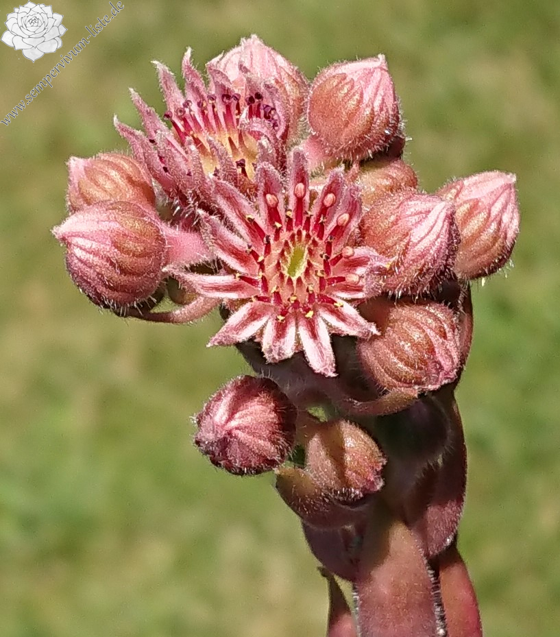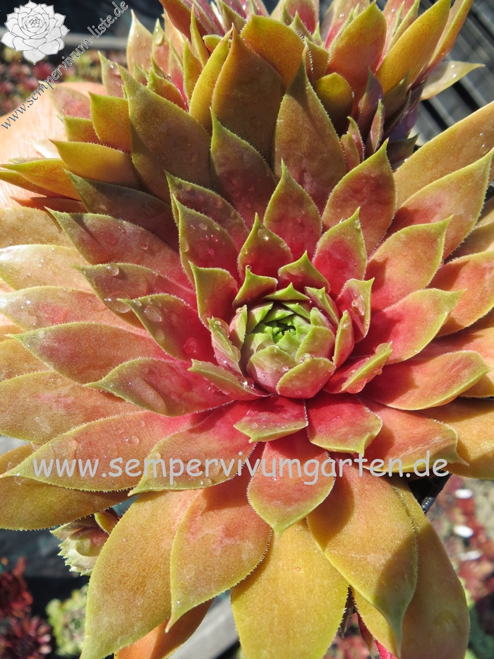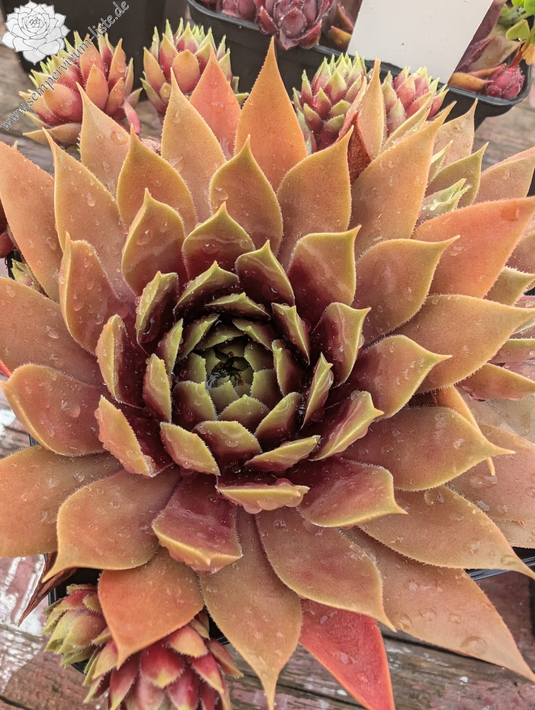 Mit Sempervivum 'Summer Skin' haben wir einen ganz neuen Hauswurz im Sortiment, der im Sommer unglaublich schöne Farben zeigt. Die Rosetten erreichen einen Durchmesser von über 10 cm und besitzen auffallend schmale Blätter. 'Summer Skin' ist wüchsig und bildet ganz dichte Polster. Besonders gut gefällt mir die interessante Rosettenform, mit den langen spitzen Blättern. Die Färbung hält sich lange und verträgt auch höhere Temperaturen. Das warm lilarot gefärbte Zentrum fällt sofort ins Auge und hebt sich deutlich von den Blattenden ab. Die Blattenden besitzen eine helle Färbung und zeigen besonders im Sommer fast hautfarbene Töne. Als kleines Extra besitzen die Rosettenherzen blaugrüne Farben . Die Pflanzen besitzen einen ganz eigenen Reiz und begeistern jeden Sommer aufs Neue. Die Blüten werden gerne von Insekten besucht.