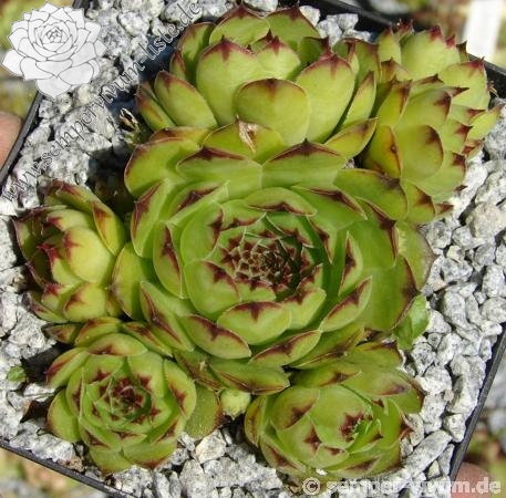 Erwin Geiger: Dieser französische Klon wurde in Frankreich bei etwa 900m ü.M. am MONT LOZÈRE in den Sevennen gefunden. Er formt kompakte Polster mit frischgrünen Rosetten, deren Blattspitzen kontrastreich dunkelbraun getönt sind.