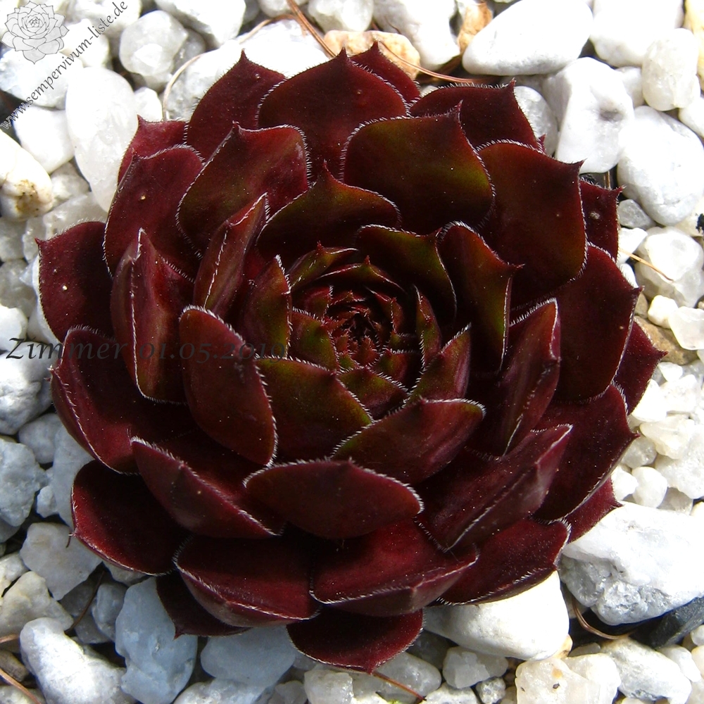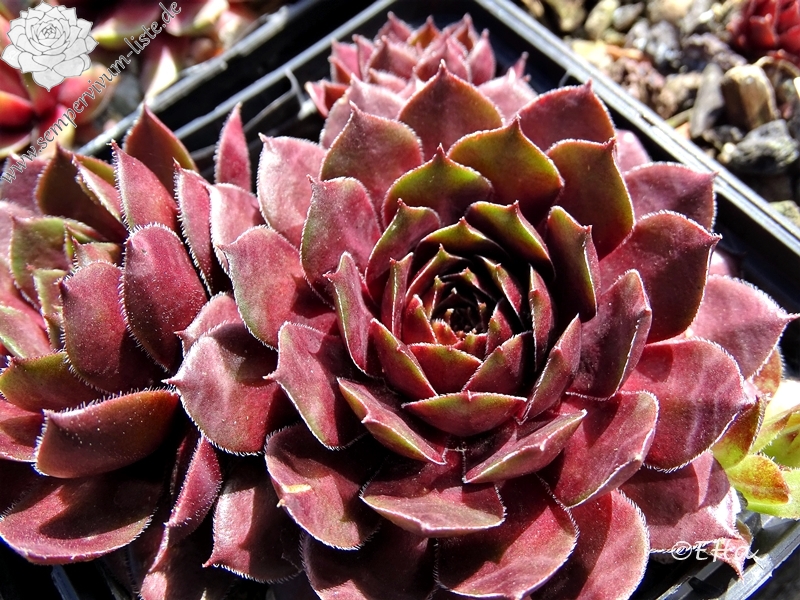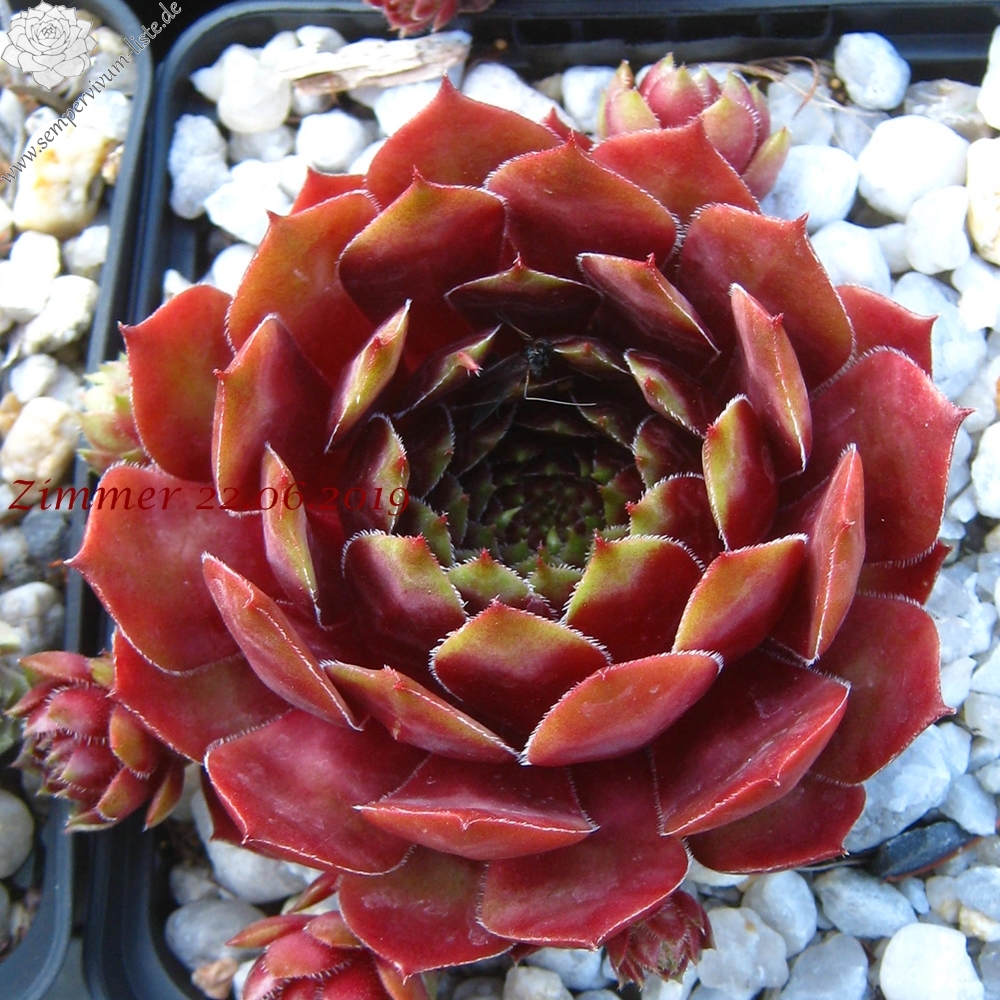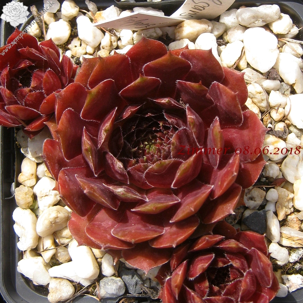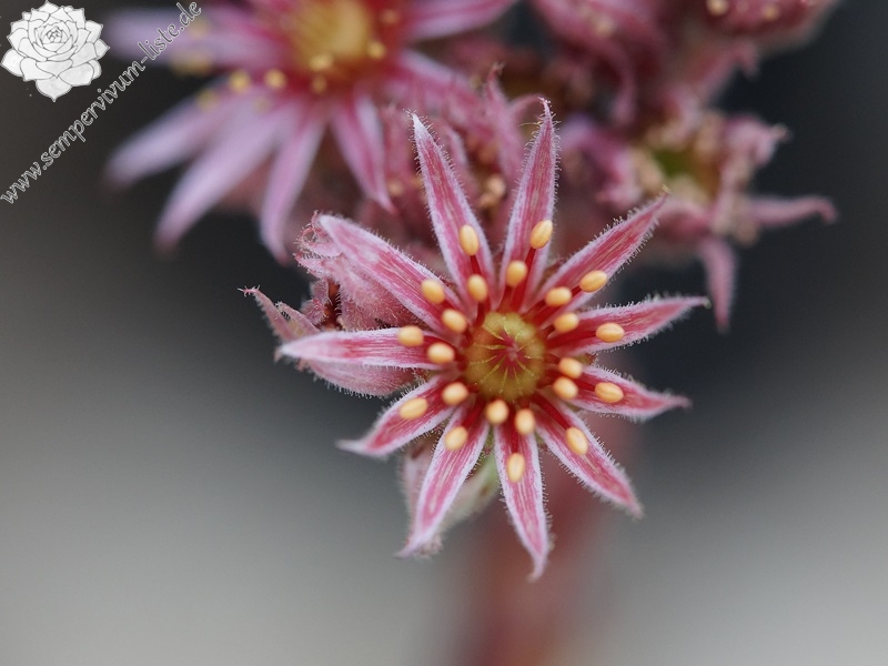 Hier haben wir nochmal einen Sämling von 'Gabrielle'. Die Rosetten erreichen einen Durchmesser von 8cm und sprossen leider nur schwach. Dafür überzeugt er durch seine auffallende Färbung und den interessanten Rosettenaufbau. Die äußeren Rosettenblätter stehen fast aufrecht und das Zentrum liegt tief in der Rosette. Die Pflanzen zeigen eine rotlila Grundfärbung. Die Blattenden färben sich zum Sommer hin immer heller, selbst die kleinen Blätter im Zentrum zeigen leuchtend orangeocker Blattspitzen. Die Blüten erscheinen nur schwach und sind sternförmig.