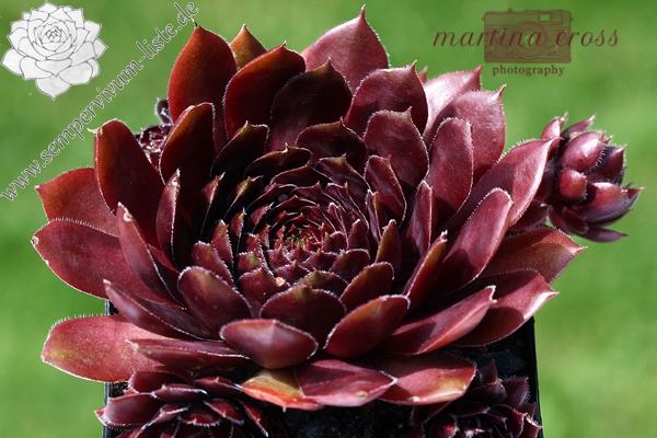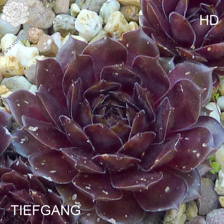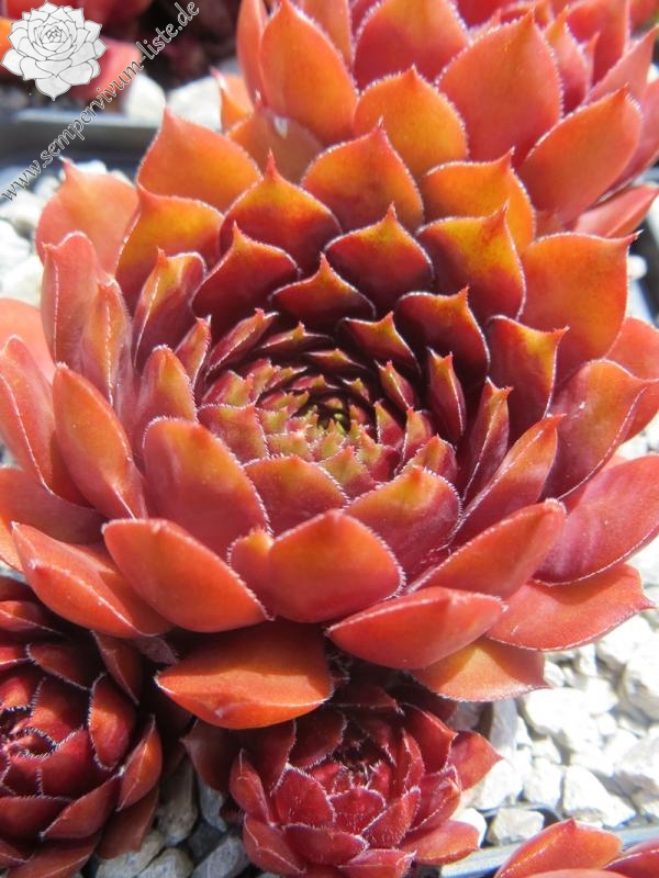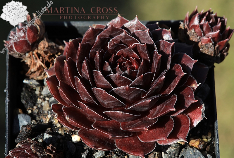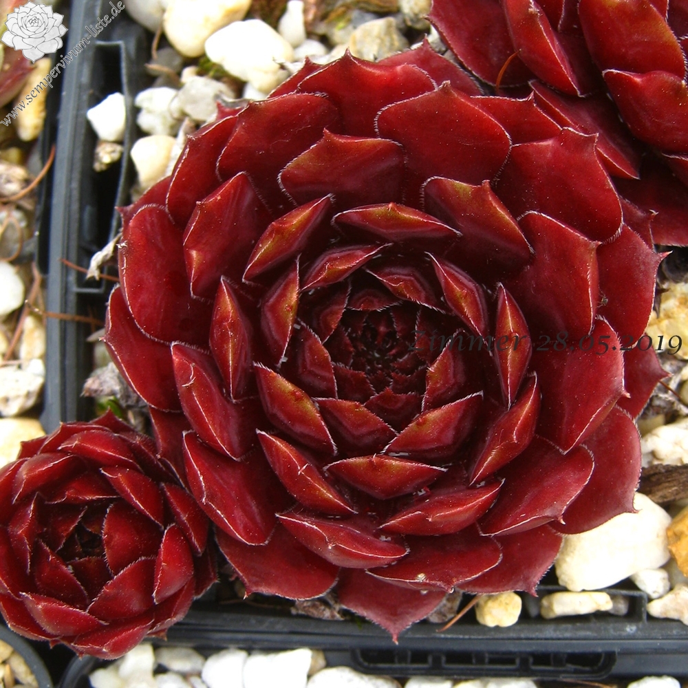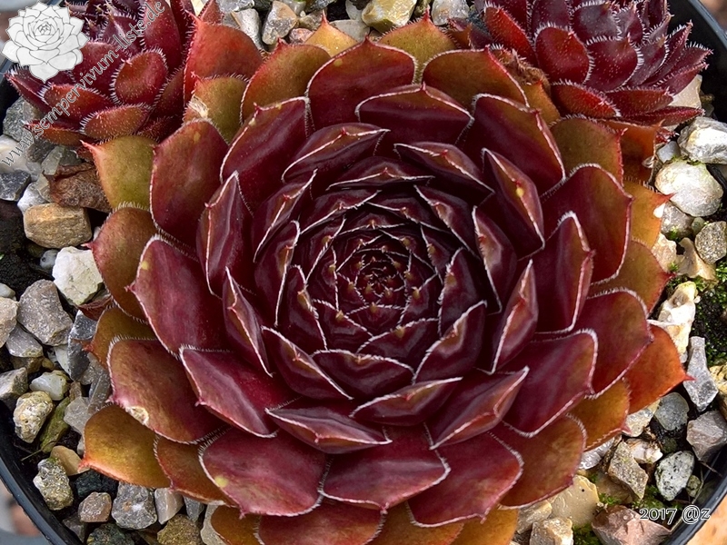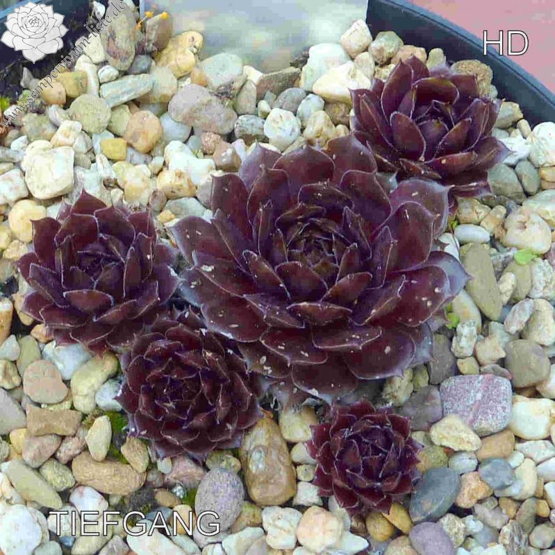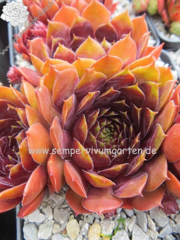 Hier haben wir nochmal einen Sämling von 'Gabrielle'. Die Rosetten erreichen einen Durchmesser von 8cm und sprossen leider nur schwach. Dafür überzeugt er durch seine auffallende Färbung und den interessanten Rosettenaufbau. Die äußeren Rosettenblätter stehen fast aufrecht und das Zentrum liegt tief in der Rosette. Die Pflanzen zeigen eine rotlila Grundfärbung. Die Blattenden färben sich zum Sommer hin immer heller, selbst die kleinen Blätter im Zentrum zeigen leuchtend orangeocker Blattspitzen. Die Blüten erscheinen nur schwach und sind sternförmig.