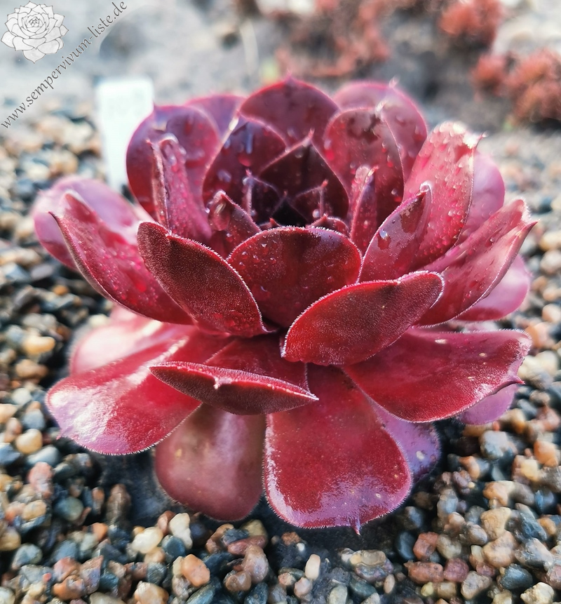 Große Rosetten von schöner Form, die Größe erreicht 10-12 cm, mit breiten Blättern, die mit samtiger Behaarung bedeckt sind. Im zeitigen Frühjahr ist die Pflanze dunkel burgunderrot; mit Einsetzen des warmen Wetters verfärbt sich die Rosette leuchtend purpurrot, hellt sich allmählich auf und wird im Hochsommer beige-orange.