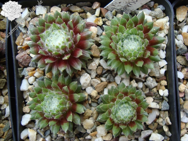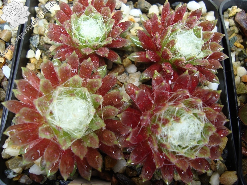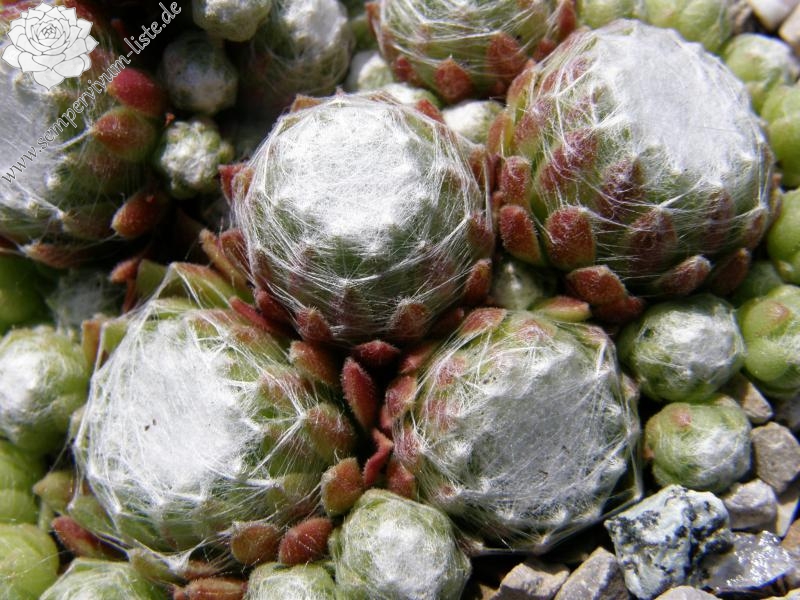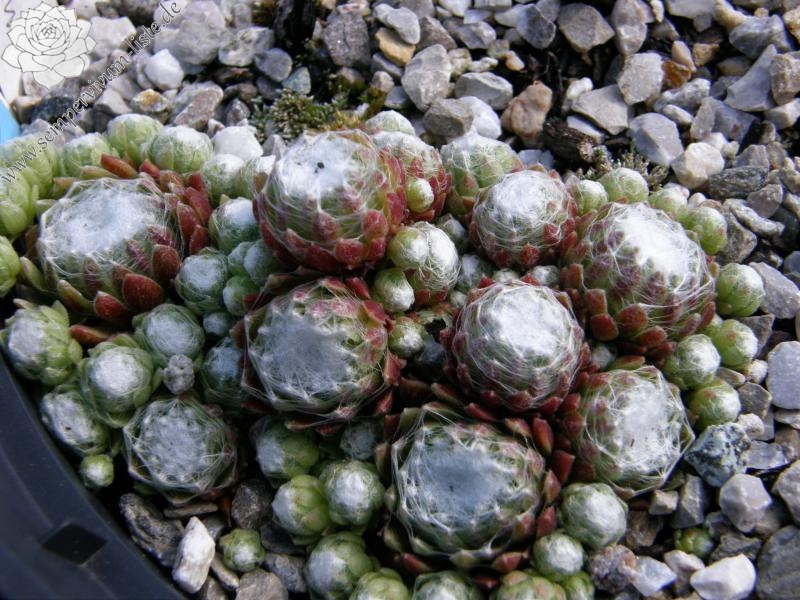 Diese Pflanze steht schon seit vielen Jahren, mit dieser Bezeichnung, in meiner Sammlung. Ich habe sie mal mit einem Schweizer Pflanzenfreund getauscht. Die Bezeichnung ist bestimmt falsch! Jedoch gefällt sie mir so gut, dass ich sie gerne behalte und weitergebe. Man wird sie mit Sicherheit nie genau zuordnen können und so bleibt sie bei mir unter diesem Namen erhalten. Die im Zentrum stark besponnenen Rosetten bilden ganz dichte, feste Polster. Die Rosettenränder behalten ihre grüne Farbe. Sie zeigt nur selten Blüten!