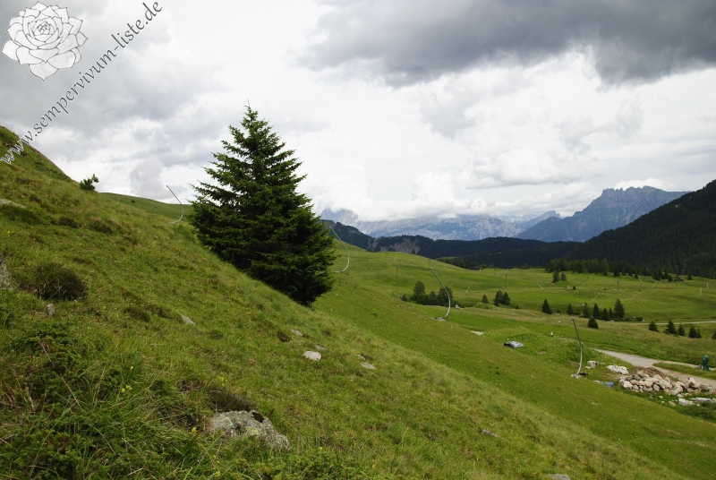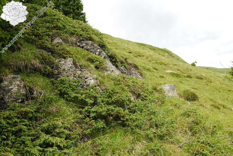 Lokalität: steiler Abhang nördlich von dem Sattel Passo di San Pellegrino, dort in der Nähe der kleinen Felsen und auch teilweise unter den Ästen der Wacholder
