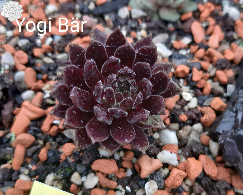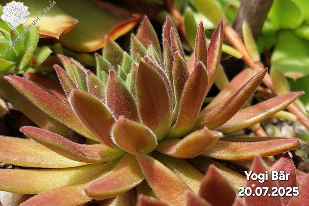 Die plüschigen Blätter von 'Yogi Bär' sind bis Anfang Juni eher einfarbig bordeauxrot und sie stehen eher aufrecht. Erst mit der Sommerhitze entfalten sich die Rosetten und werden flacher. Die mittleren Blätter bleiben in der Farbe erst mal so wie vorher, aber zu den äußeren Blättern hin mischen sich immer mehr goldbraune Töne dazu und die äußersten Blätter beginnen zu glänzen. Das kleine Herz bleibt grün. Die Rosetten werden 7 - 8 cm groß.
