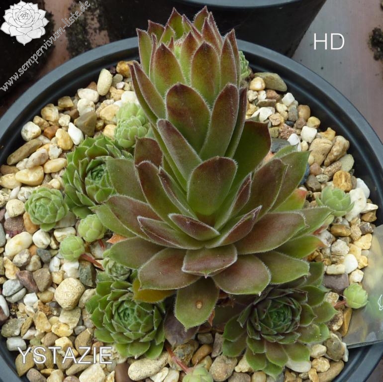Sempervivum 'Ystazie' ist eine rötliche, wüchsige Pflanze. Sie ist sehr wüchsig und bildet schnell Polster. Besonders schön hebt sich die weiße Behaarung von der roten Grundfärbung ab.