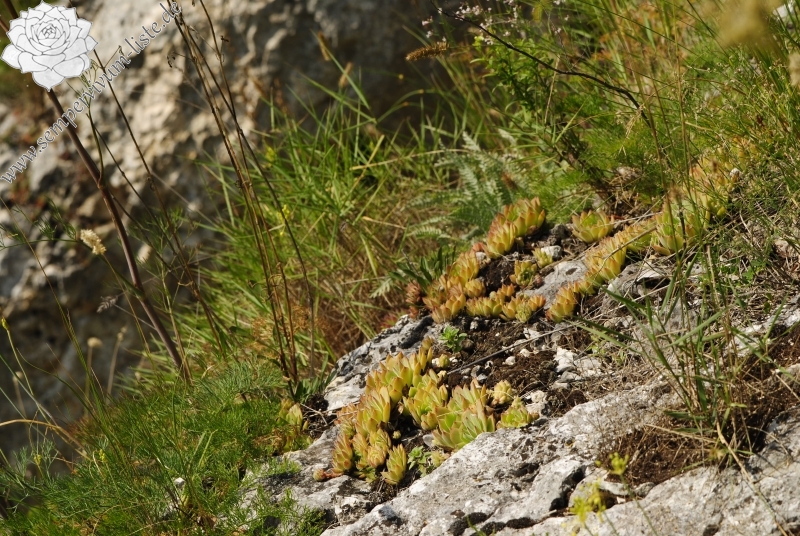 Zu den Pflanzen:Alle Rosetten am Naturstandort waren frisch grün gefärbt in der Zeit meines Besuches, die Spitzen der Rosettenblätter mancher Rosetten waren orange-rot gefärbt. Die Rosettenblätter waren ziemlich dick, an den beiden Flächen waren die Rosettenblätter dicht drüsig behaart. Viele Rosetten haben neue Ausläufer gebildet, die Ausläufer waren oft um 7 cm lang und dick. Blüten habe ich am Naturstandort nicht beobachtet, ich habe nur eine Rosette etwa 3 Wochen vor Blütezeit am Naturstandort gesehen.