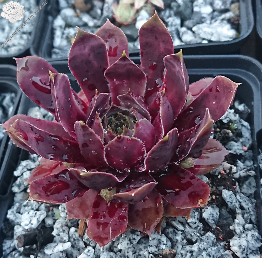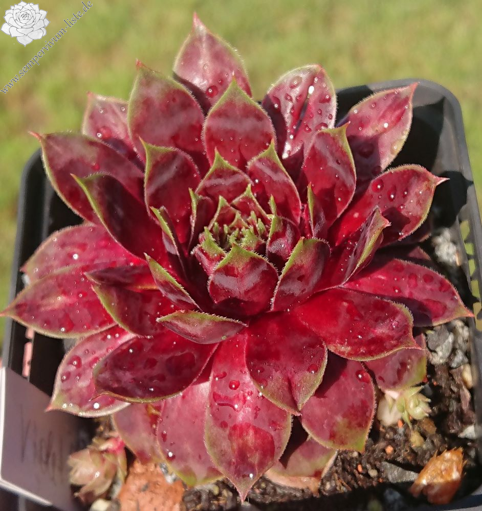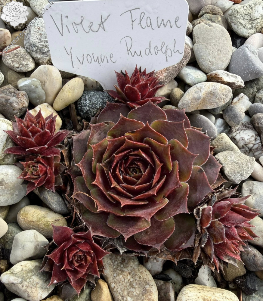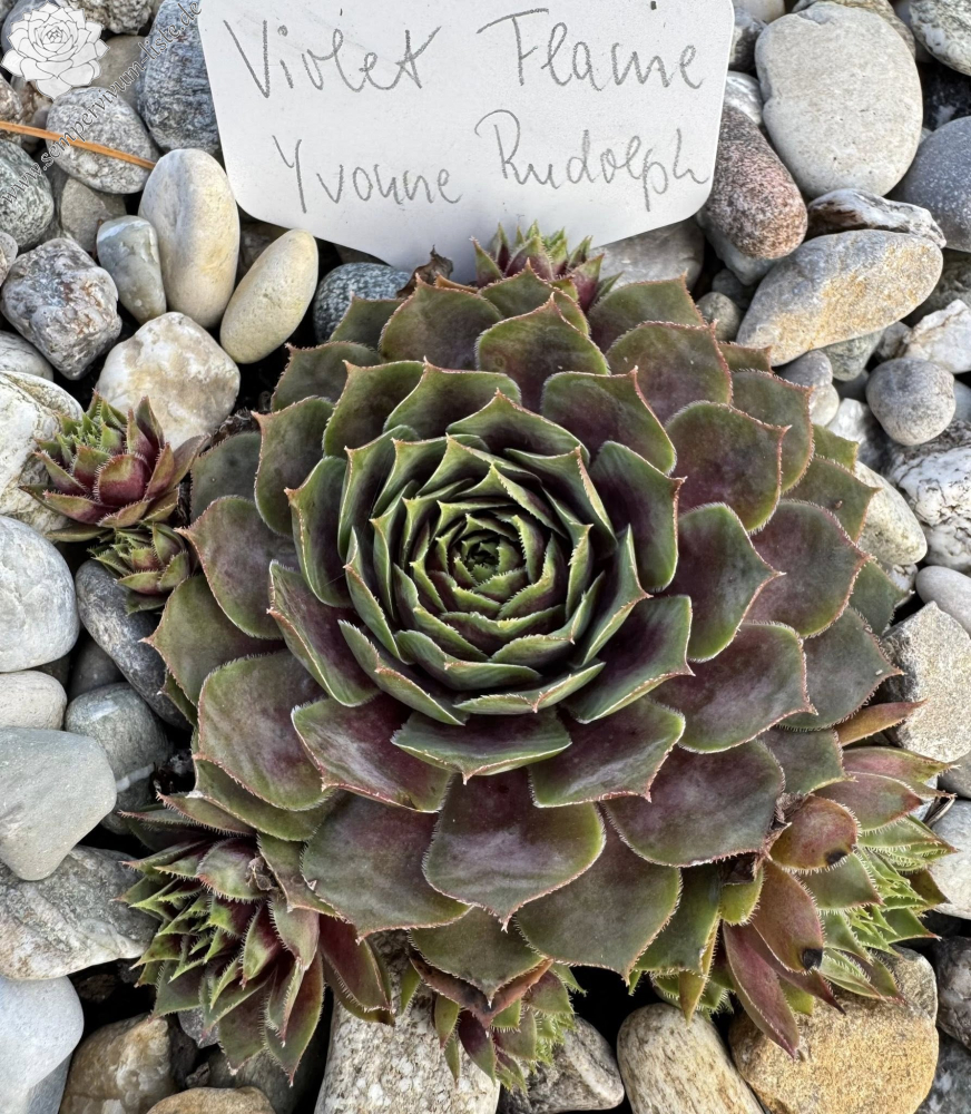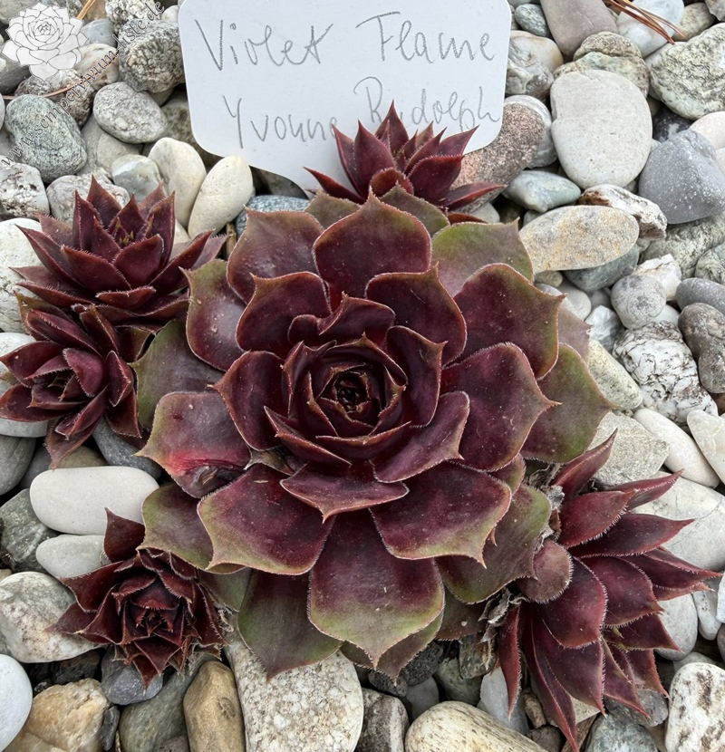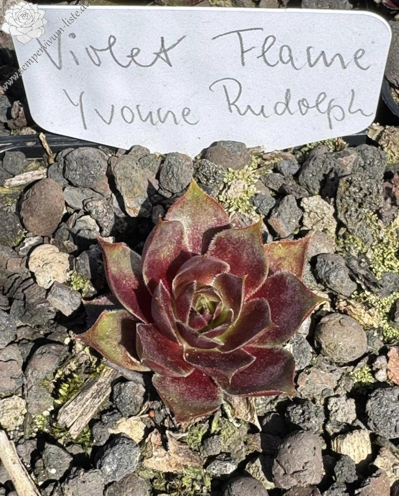 Violett Flame ist ein Geschwistersämling von 'Anadyr' und 'Grinch' aus der Selbstaussaat von 'Sky Rockoon'. Sie zählt zu den dunklen Variationen im Frühling mit einer äußerst dunklen Farbe, wobei die Spitzen der Blätter marmoriert sind und die Dornen auffällig gelb/grün gefärbt sind, was einen schönen und auffälligen Kontrast erzeugt. Im Sommer verfärben sich die Blattspitzen allmählich ins Grüne, während das Zentrum in einem kräftigen Violettton erstrahlt. Die Blätter sind Spatel förmig und kurz bespitzt, die Rosetten können eine Größe von etwa 10cm erreichen. Sie ist gut wüchsig und ist unempfindlich gegenüber Hitze oder Nässe.